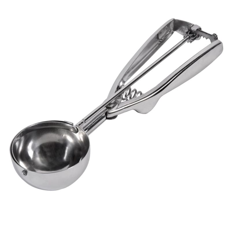 Метална лъжица за сервиране на сладолед, изработена от неръждаема стомана с механизъм и ергономични дръжки за стабилен захват и ефективност при работа.