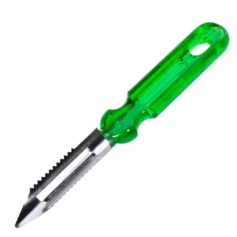 Кухненска белачка за краставици с назъбено острие от неръждаема стомана с ергономична пластмасова дръжка в зелен цвят за по-добър захват без опасност от приплъзване.