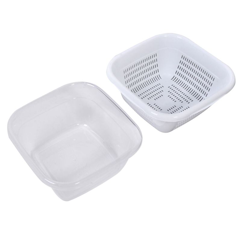 Кухненски комплект от пластмасова купа за миене на плодове и зеленчуци с практична цедка за отцеждане на водата.