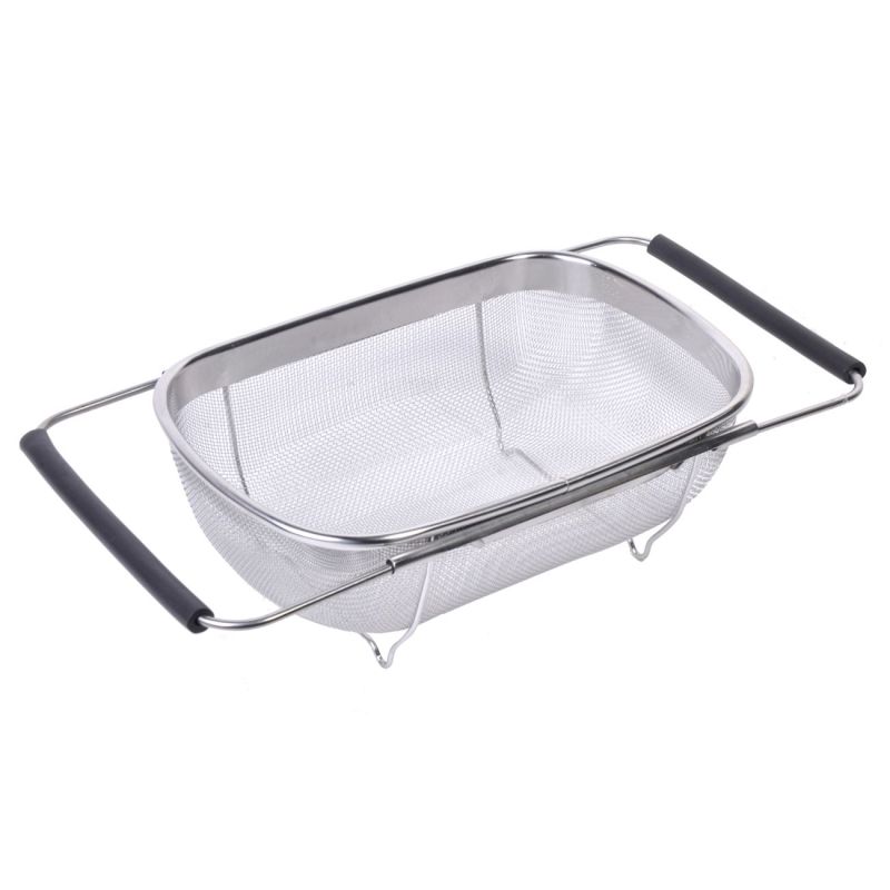 Кухненски гевгир, изработен от неръждаема стомана за миене на плодове и зеленчуци с метална мрежа за отцеждане на водата и разтегателни дръжки според големината на купата.