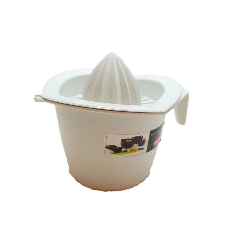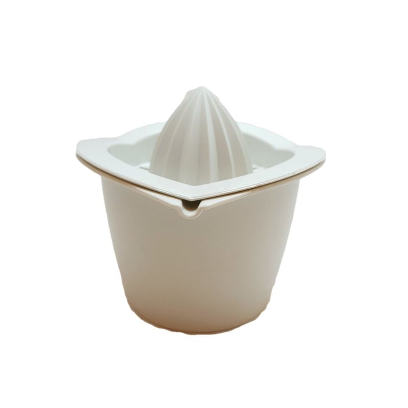 Ръчна цитрус преса за изтискване на плодове, изработена от качествена пластмаса в бял цвят с практична купа за събиране на сока.