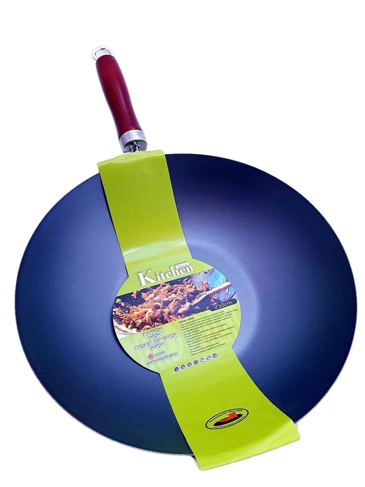 Уок тиган изработен от висококачествена въглеродна стомана, с дървена дръжка в овална форма за стабилен захват и ефективност при работа.