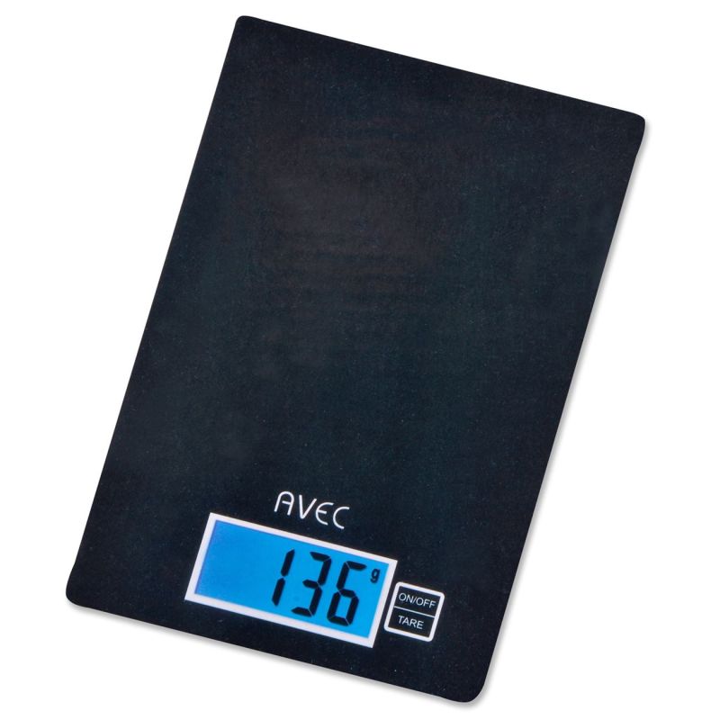 Електронна кухненска везна AVEC, изработена от висококачествено стъкло в черен цвят с капацитет 5 кг. Разполага с LCD екран.