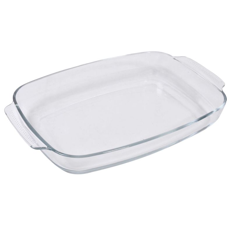 Голяма стъклена тава, изработена от високоустойчиво огнеупорно стъкло с практични дръжки от двете страни.