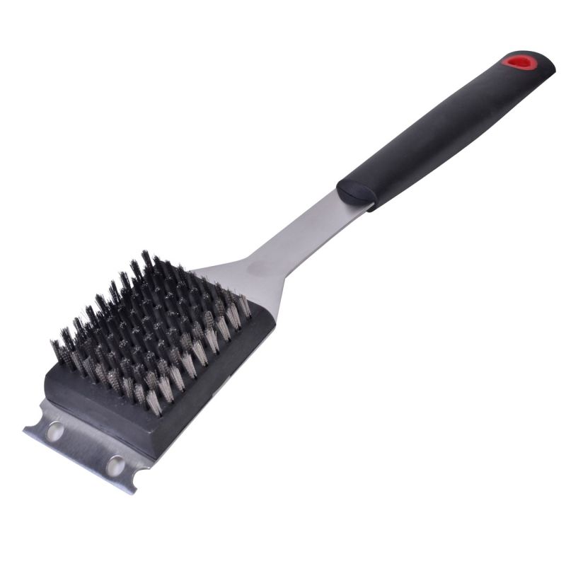 Голяма четка с шпатула за почистване на барбекю и скара с овална пластмасова дръжка в черен цвят за удобен захват без приплъзване по време на работа.