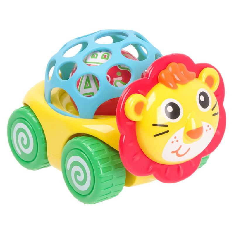 Пластмасова играчка дрънкалка за бебета във формата на симпатично многоцветно лъвче с топка.