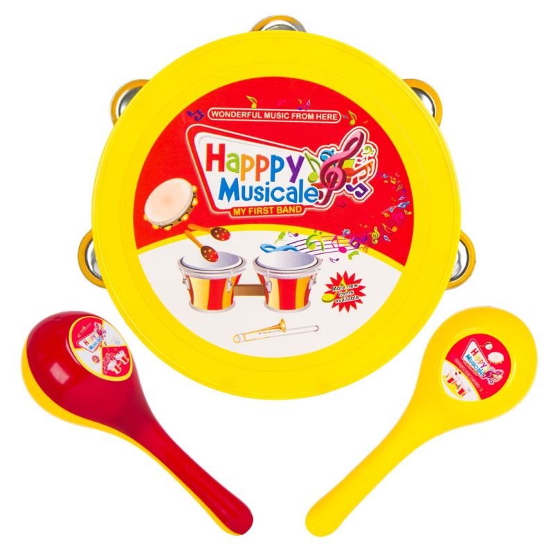 Музикален комплект от 3 броя бебешки играчки - дайре в жълт цвят и маракаси в жълто и червено.