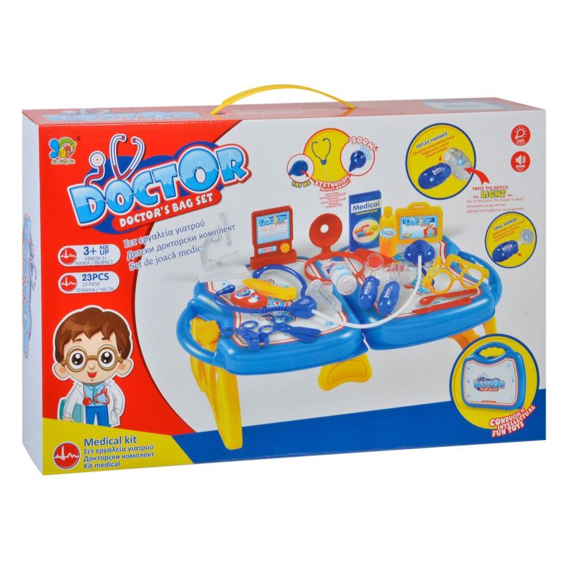 Детски лекарски комплект от 23 части - куфарче, което става медицинска маса с инструменти и аксесоари - стетоскоп, светещо рефлексно чукче, светещо огледало за уста, спринцовка, ножици, термометър, микроскоп, очила, скалпел, кутийки и шишета за лекарства, апарат за сърдечна дейност и други.