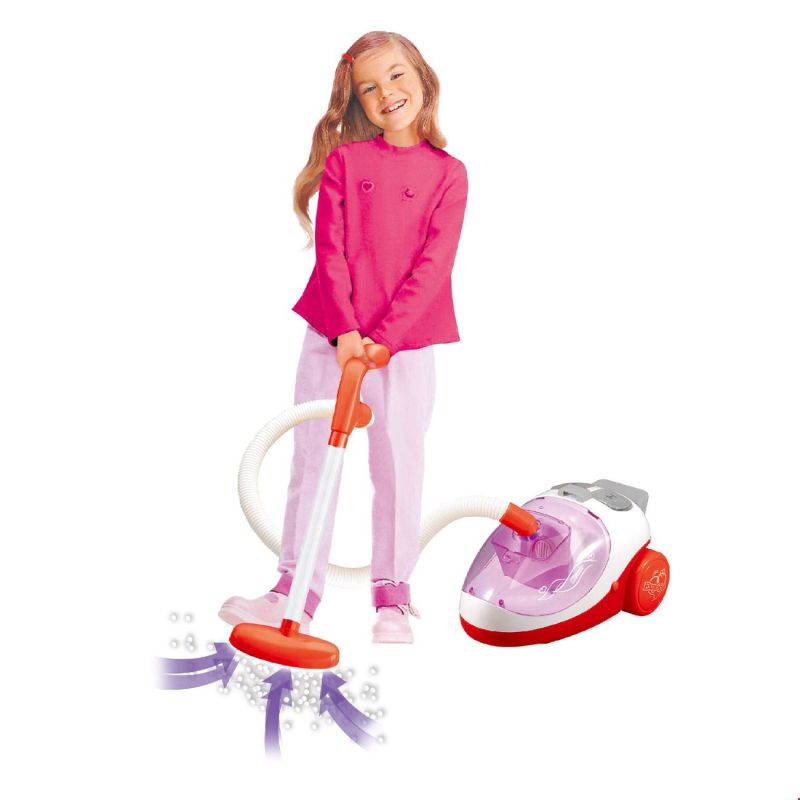 Детска прахосмукачка в розов цвят със светлинни ефекти и аксесоари.