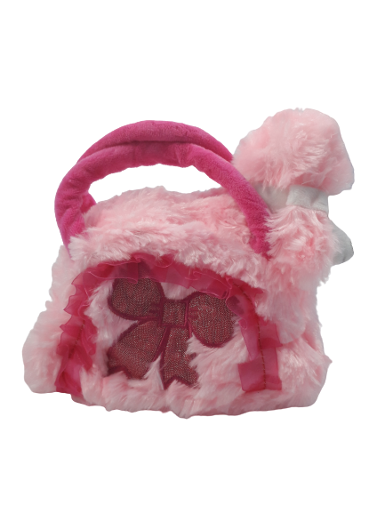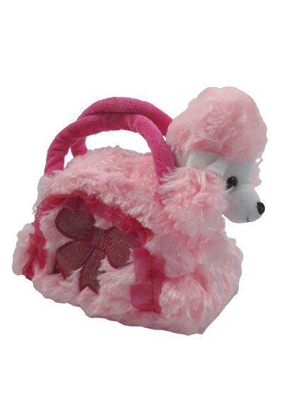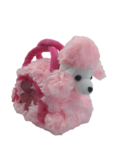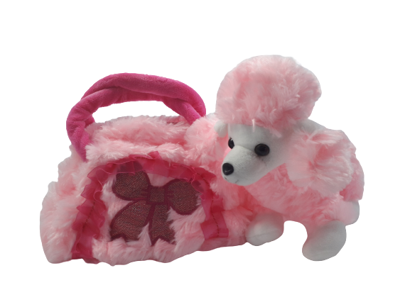 Плюшена бебешка играчка във формата на кученце пудел с плюшена чантичка в розов цвят с дръжки и цип.