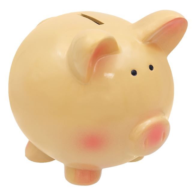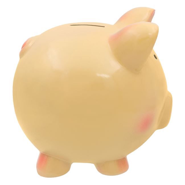 Класическа детска касичка за монети във формата на прасе в бледо розов цвят.