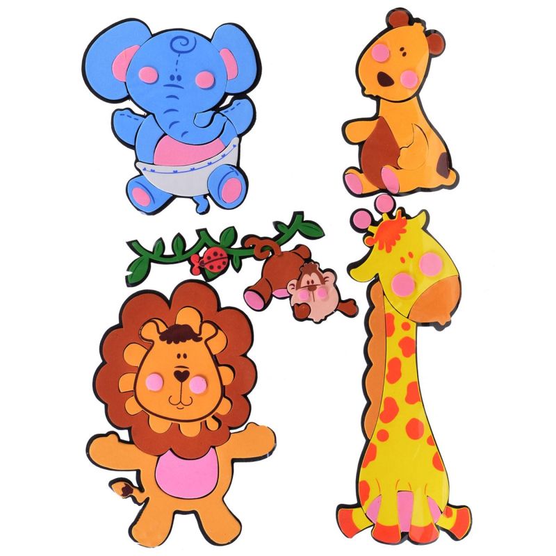 Комплект от 5 части детски стикери за стена във формата на животните от джунглата - слон, тигър, маймунка, лъв и жираф, които ще зарадват всяко дете, което обича животните.