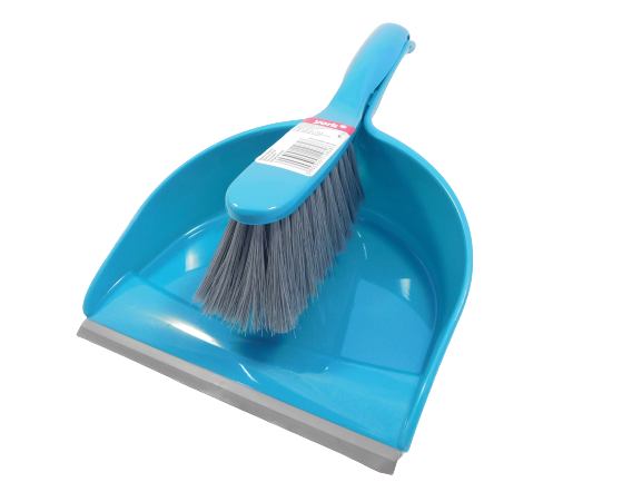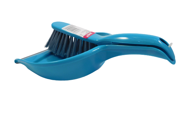 Универсален кухненски комплект от домакинска четка и пластмасова лопатка в син цвят за почистване на маса или други гладки повърхности.