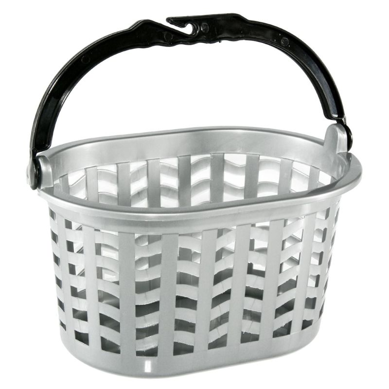 Кошница за щипки за пране, изработена от здрава пластмаса в сребрист цвят с удобна дръжка със закачалка.