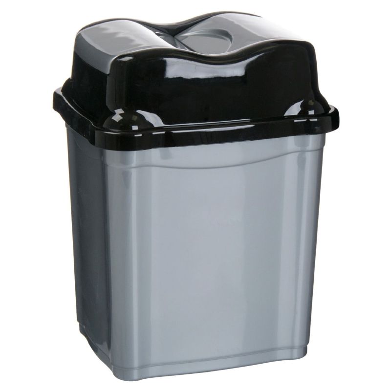 Кошче за отпадъци с подвижен капак, изработен от висококачествена пластмаса в сиво и черно.
