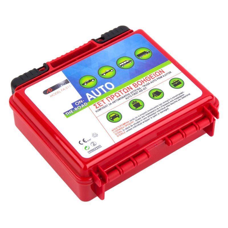 Комплект за автомобилна аптечка, съдържащ всички необходими принадлежности за оказване на първа помощ на пострадал.