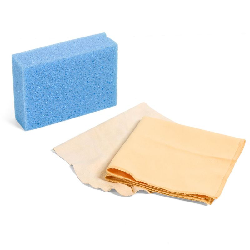Практичен комплект за почистване на автомобила от 3 части - гъба, кърпа и микрофибърна кърпа.