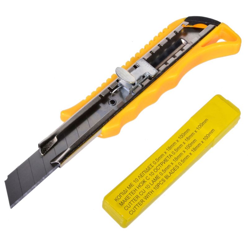 Професионален макетен нож с пластмасова дръжка и 10 резервни остриета (0.5 х 18 х 100 мм.).