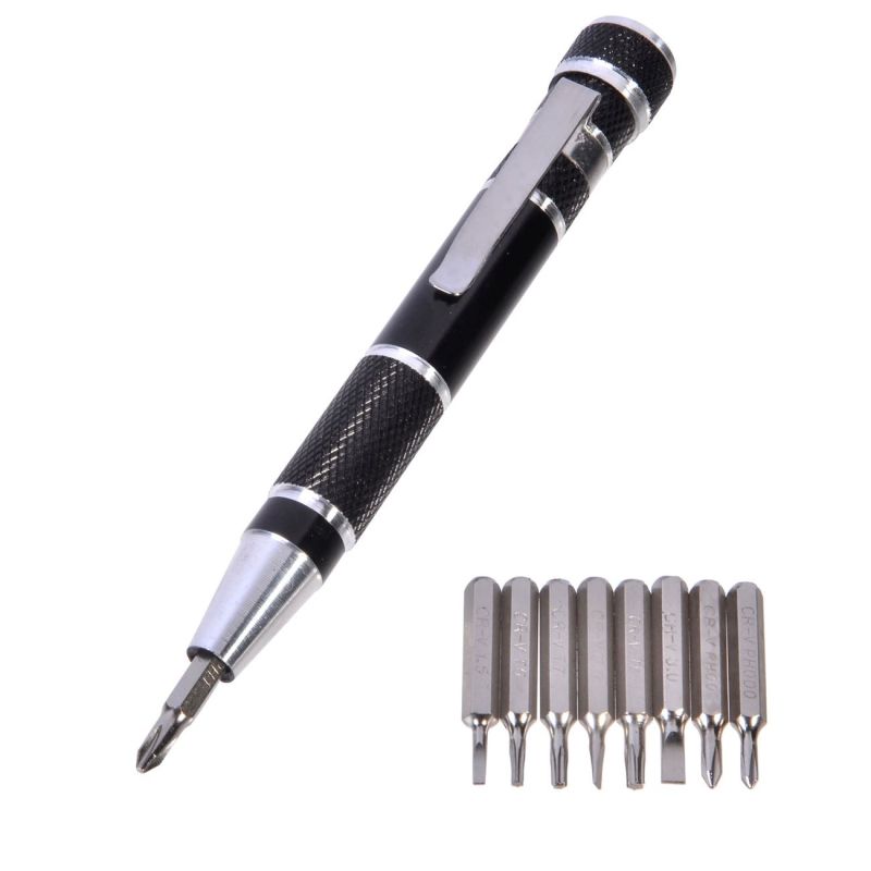 Мултифункционална отвертка в формата на писалка с 9 сменяеми магнитни кръстати и плоски накрайника за универсална употреба.