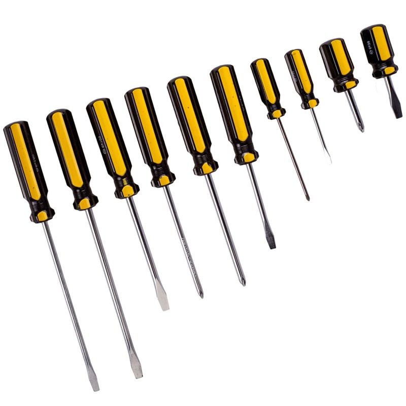 Комплект от 10 броя кръстати и плоски отвертки с различни размери за универсална употреба.