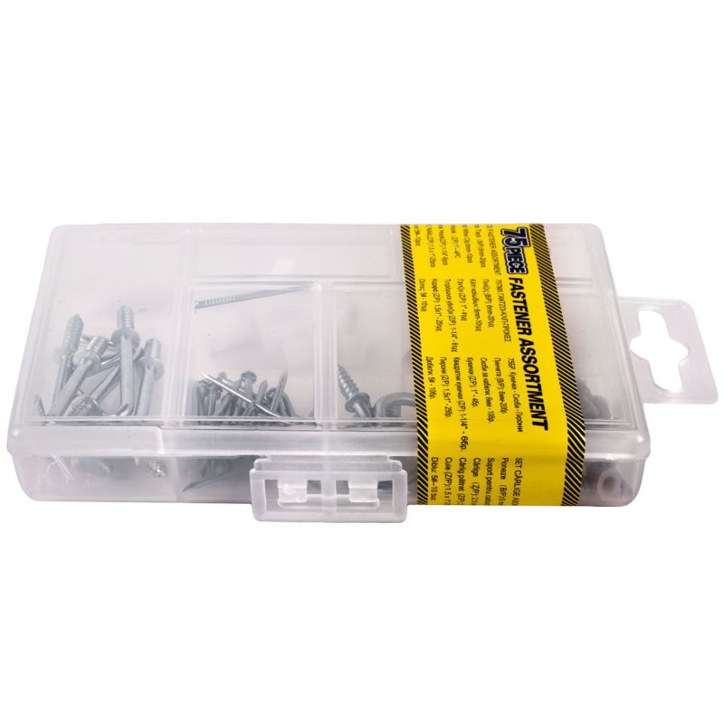 Практичен комплект от 75 броя захващащи елементи - кукички, скоби, пирони и други в удобна пластмасова кутийка за съхранение.