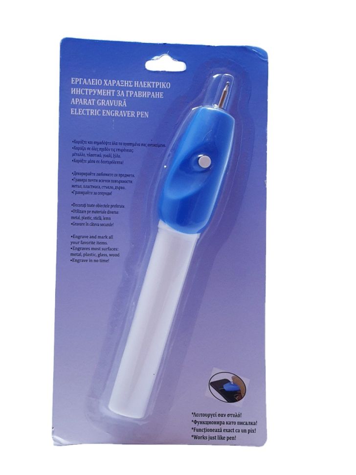 Електрическа писалка за гравиране върху дърво, пластмаса, метал, стъкло, керамика, кожа, плексиглас и твърда гума.