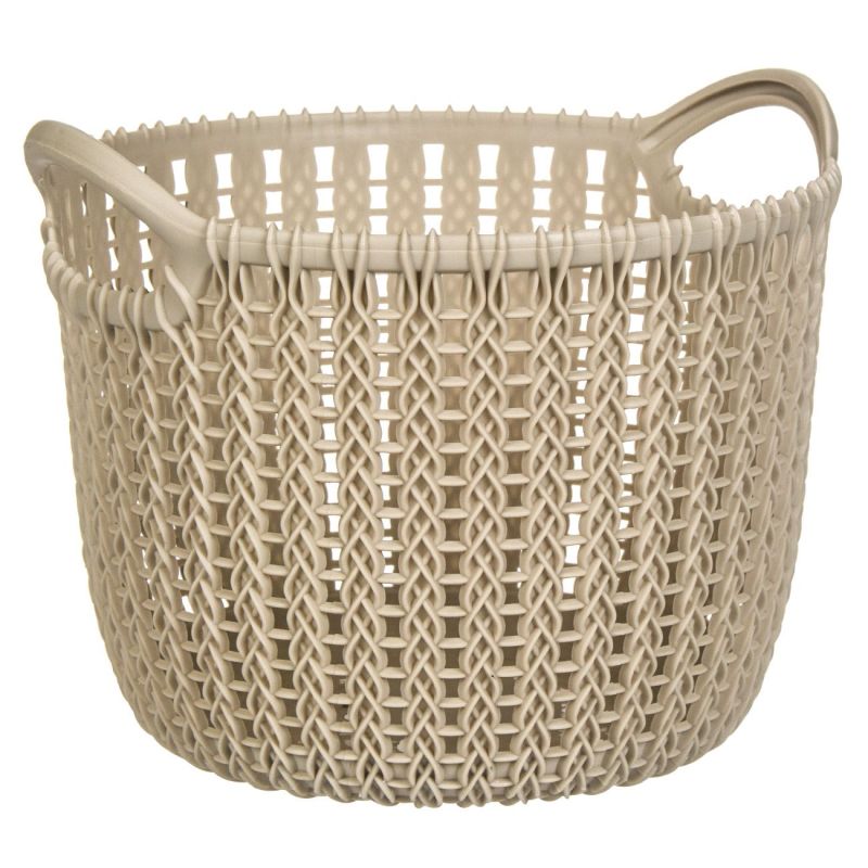 Кръгла кошница за съхранение изработена от висококачествена пластмаса, която имитира плетка в бежов цвят с удобни дръжки за лесно носене.
