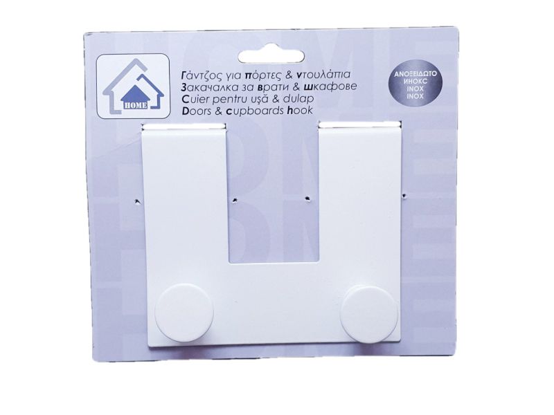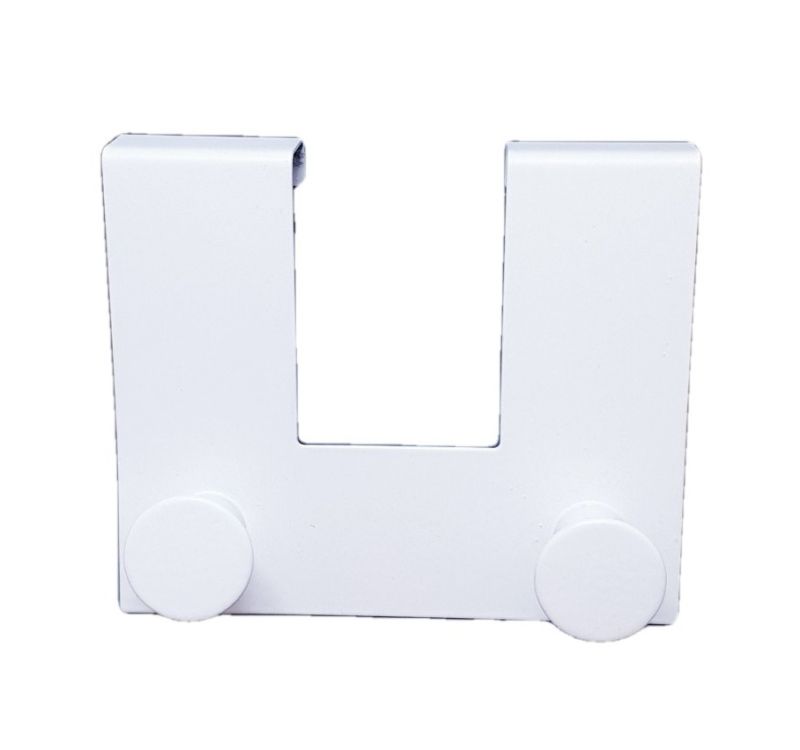 Универсална закачалка за врата, изработена от неръждаема стомана в бял цвят с 2 кръгли куки за закачане на дрехи, чанти и други.