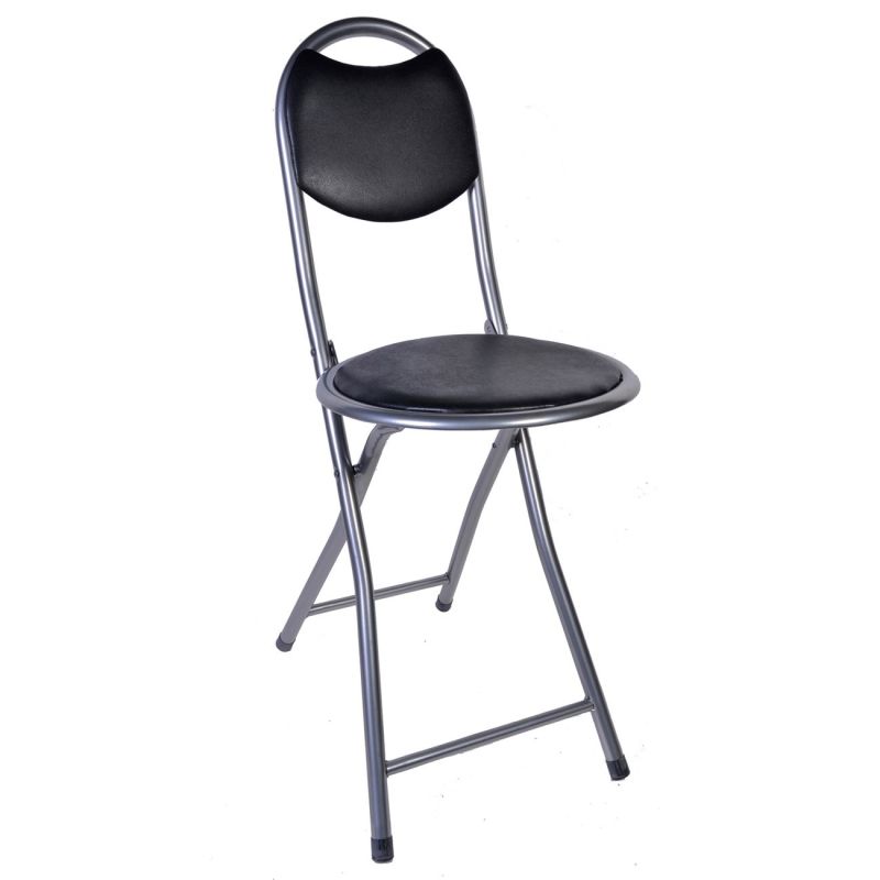 Функционален сгъваем стол с рамка от стомана и мека седалка и облегалка. Седалката и облегалката са изработени от дунапрен с PVC покритие в черен цвят.