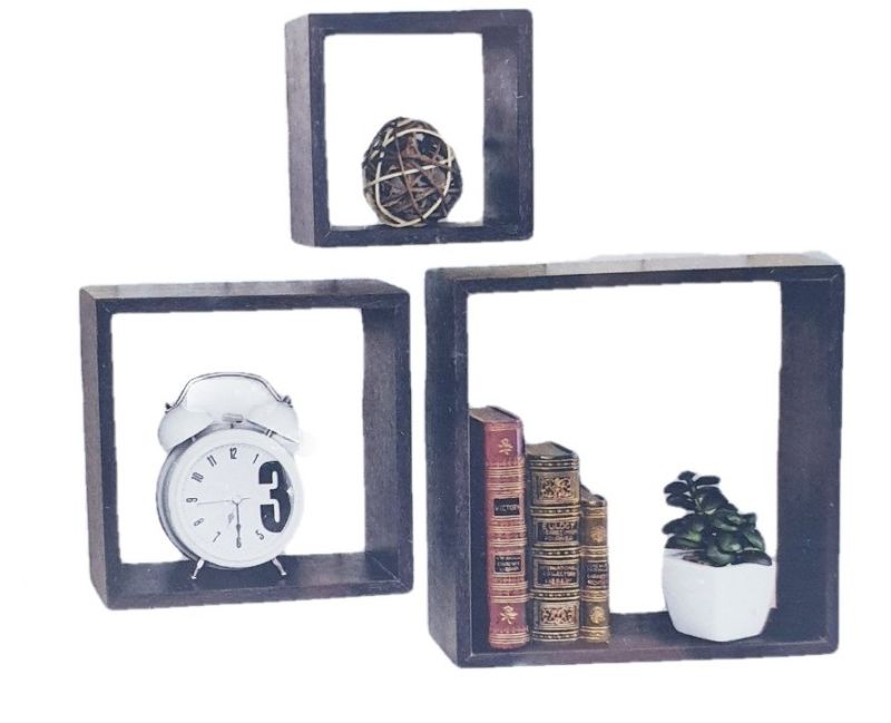Комплект от 3 броя квадратни етажерки за стена, изработени от висококачествена дървесина венге в тъмно кафяв цвят със скрити подпори.