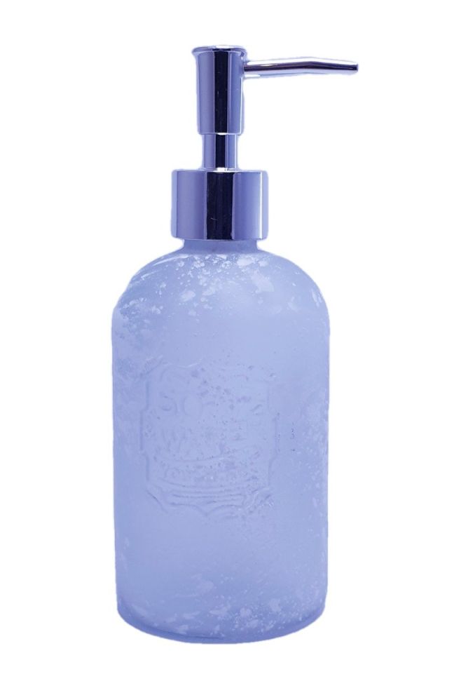 Диспенсър за течен сапун, изработен от висококачествено стъкло в бял цвят с "напръскан" ефект и метална капачка.