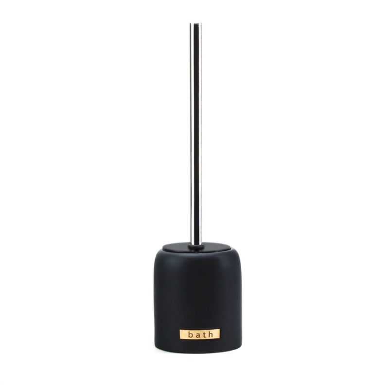 Комплект за тоалетна, състоящ се от четка с метална дръжка и прикрепен капак, който идеално затваря поставката.
