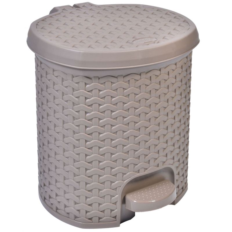 Кош за отпадъци с капак, изработен от здрава и устойчива пластмаса, която имитира ратанова плетка в бежов цвят.