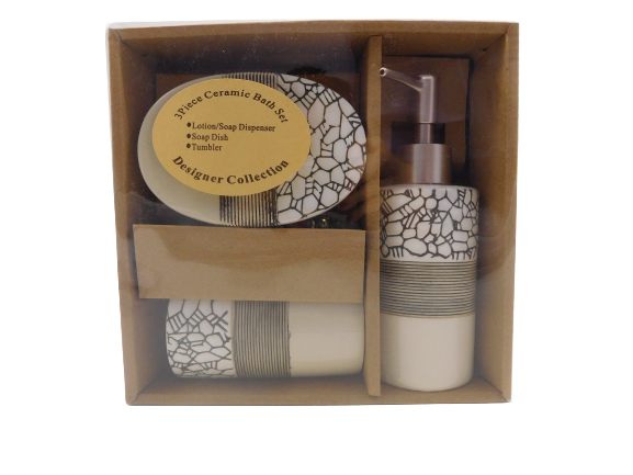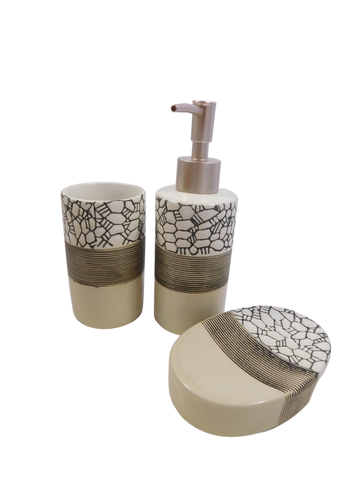 Комплектът включва керамична сапунерка (12 см.), чаша за четки и паста за зъби (10 см.) и диспенсър за течен сапун (18 см.).