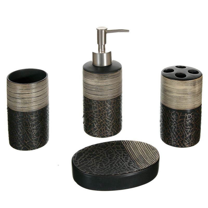 Луксозен комплект висококачествени керамични аксесоари за баня в тъмно кафяв цвят с релефни пръстени и шарки тип мозайка.