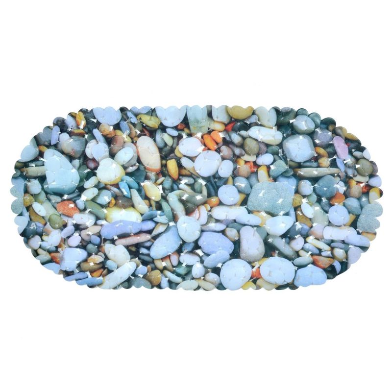 Постелка за баня, изработена от здрава и устойчива пластмаса с противохлъзгащо покритие и красива щампа на морски и речни камъчета.