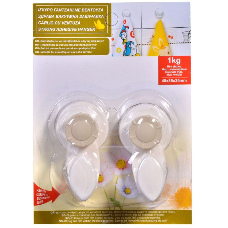 Комплект от 2 броя вакуумни закачалки за стена, изработена от висококачествена пластмаса в бял цвят с бежов акцент и вендуза за отлично закрепване към стена.