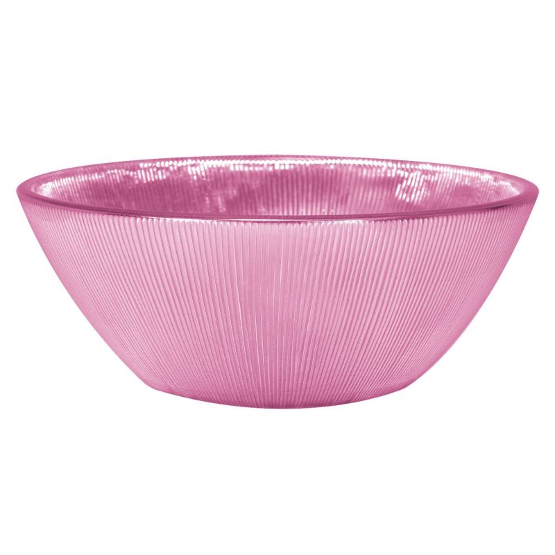 Купа за хранене и сервиране, изработена от устойчиво стъкло в цикламен цвят с релефна външност.