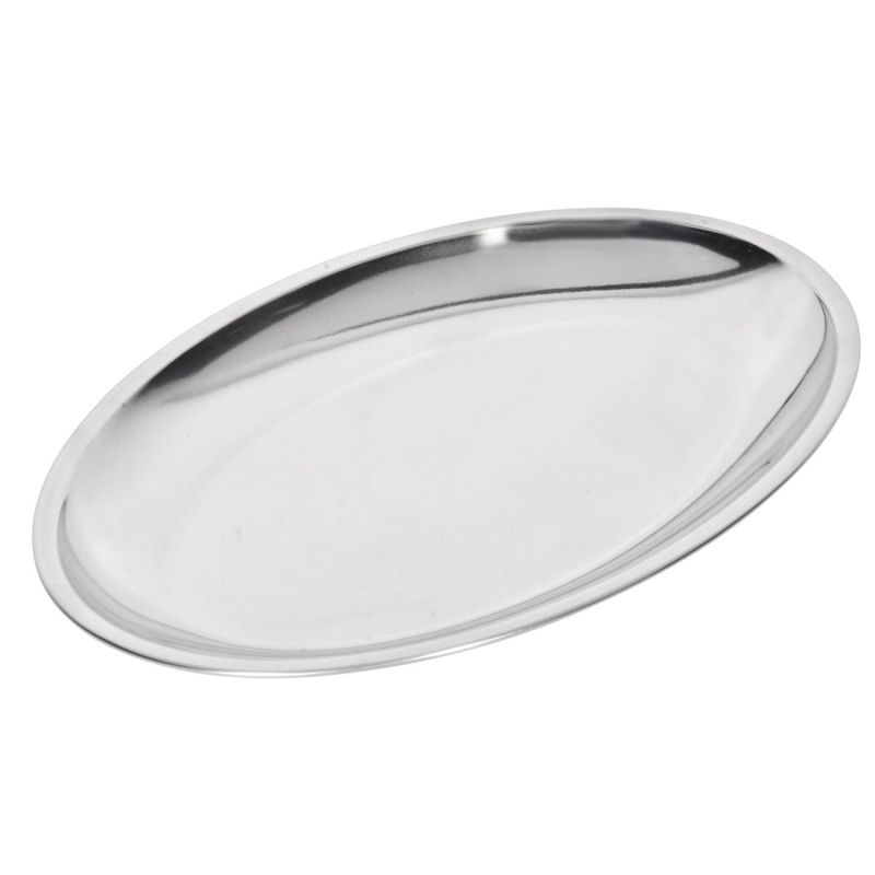 Овална чиния, изработена от неръждаема стомана в цвят инокс.