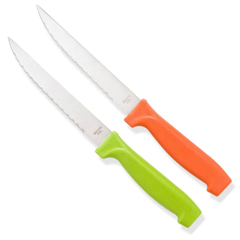 Комплект от 6 броя универсални кухненски ножове, изработени от неръждаема стомана с цветна пластмасова дръжка - 3 зелени и 3 оранжеви.