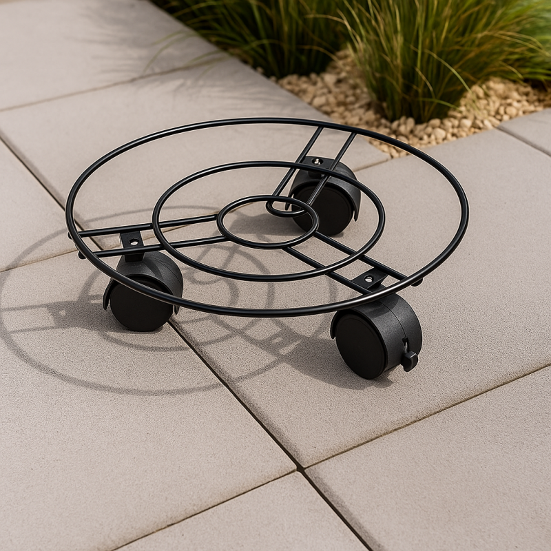 Поставка за саксия, изработена от качествена и устойчива метална сплав в черен цвят с колелца.