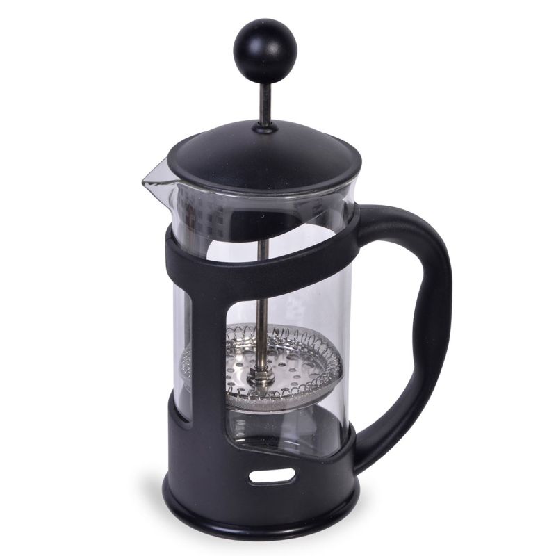 Класическа френска преса за приготвяне на филтър кафе, чай или други горещи напитки, изработена от висококачествени материали - стъкло и пластмаса в черен цвят.
