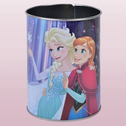 Цилиндричен моливник, изработен от качествена метална сплав с красива цветна картинка на любимите героини от Замръзналото кралство - Елза и Анна.