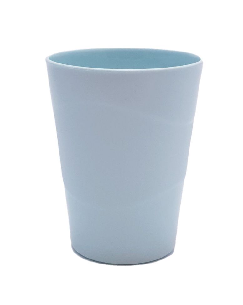 Водна чаша, изработена от плътна непрозрачна пластмаса в светло син цвят с вълнообразни линии.