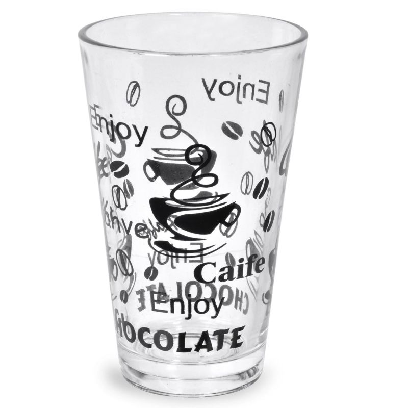 Водна чаша, изработена от висококачествено прозрачно стъкло с черна щампа на чаши и зърна кафе.
