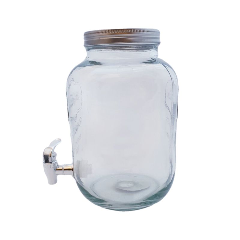 Буркан с релефен напис и четвъртита форма, изработен от качествено стъкло с метален капак и канелка за напитки.