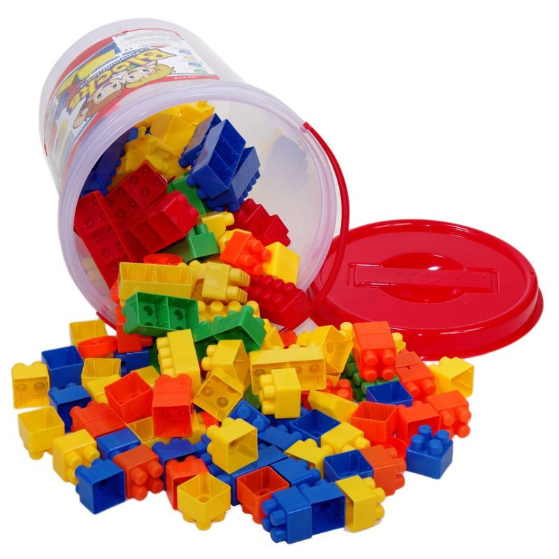 Голям детски конструктор за сглобяване, изработен от качествена и безвредна пластмаса в различни ярки цветове в опаковка във формата на кофичка с дръжка.