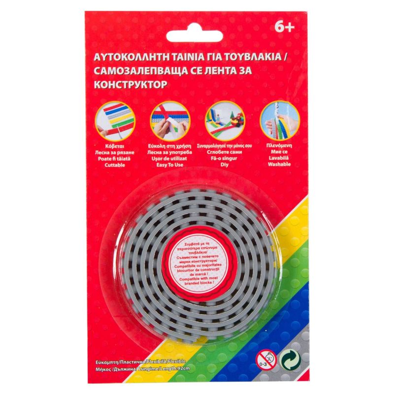 Пластична самозалепваща се лента за детски конструктори, изработена от устойчива пластмаса в сив цвят.