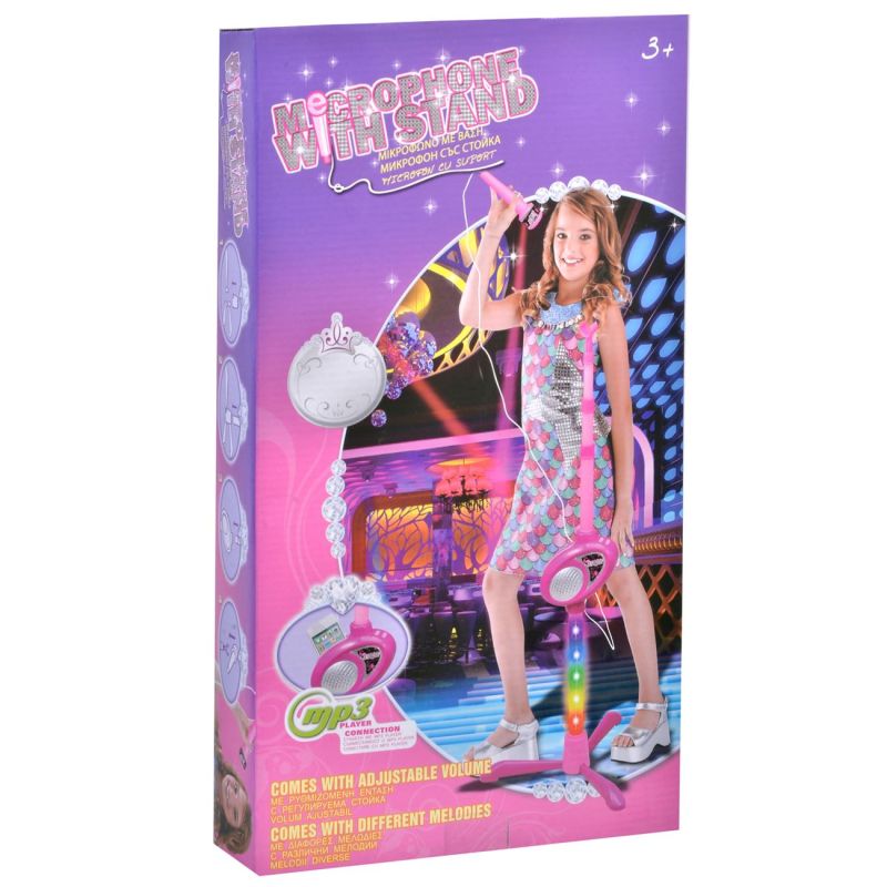 Детски микрофон на стойка в розови нюанси със звукови и светлинни ефекти.