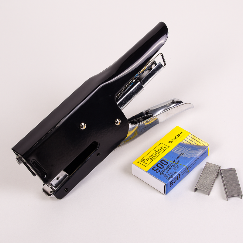 Професионален черен телбод с размери 16 х 6 см., който работи с телчета 24/6 и 26/6 + кутия с 500 телчета за телбод.
